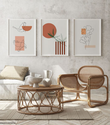 Esse trio é super vibrante e divertido, com aquele toque retrô-meets-tropical minimalista! As cores quentes contrastando com o azul suave criam um clima moderno e acolhedor ao mesmo tempo
