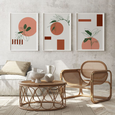 Esta composição celebra a fusão entre o natural e o geométrico em três peças modernas que exploram folhas delicadas sobre formas sólidas. Com tons quentes e traços minimalistas, é a escolha ideal para quem deseja um ambiente elegante.